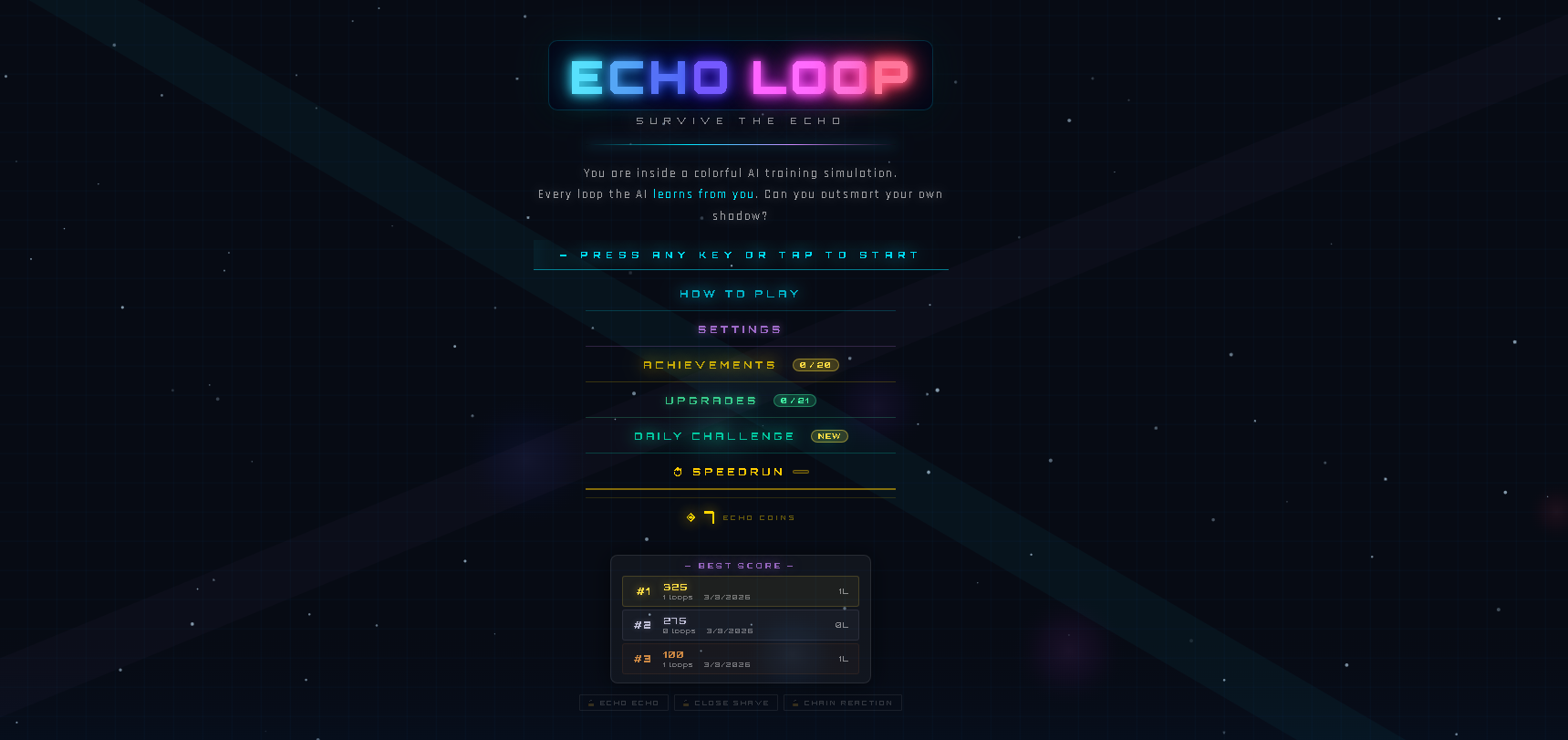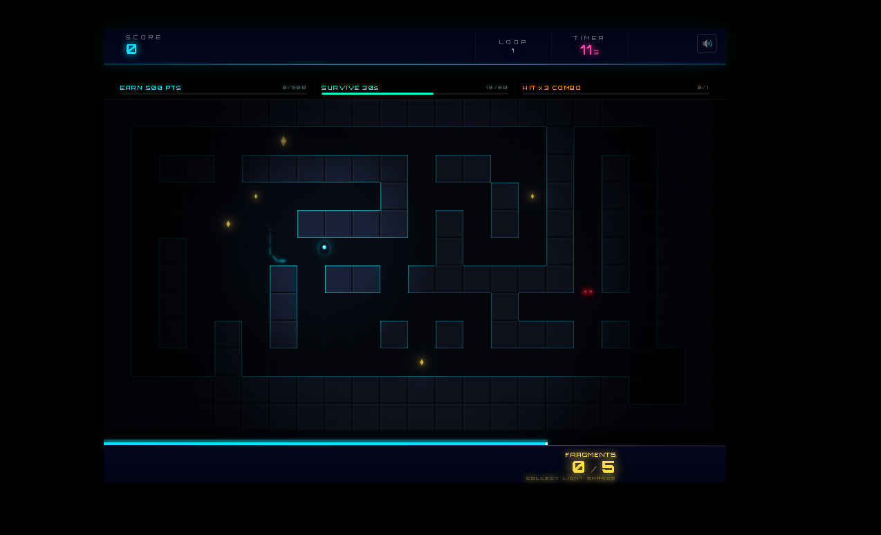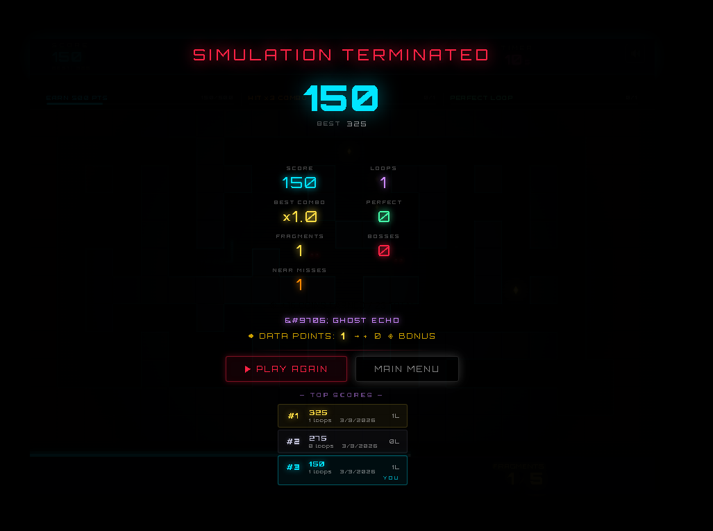 Collect echoes to increase your score, avoid incoming enemies, and adapt to the increasing speed and intensity of the loop. The longer you survive, the more chaotic the system becomes.