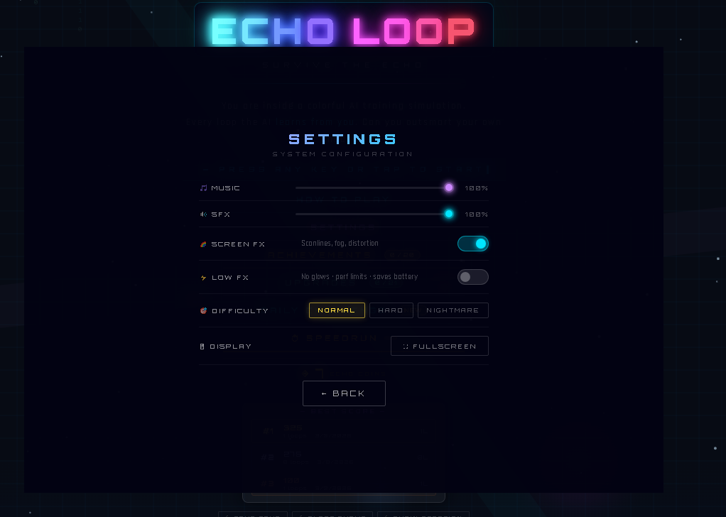 Echo Loop is a minimalist neon survival game set inside a glowing digital arena.